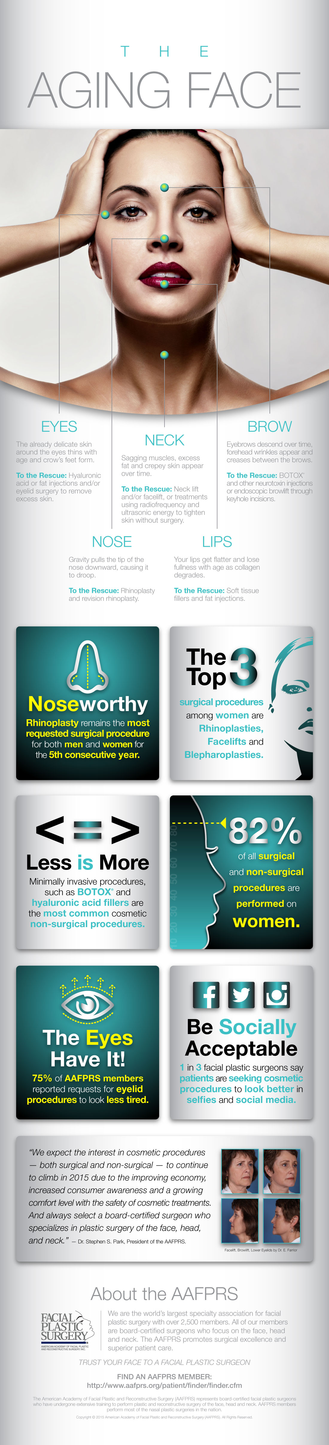 Which areas worry you most? The American Academy of Facial Plastic and Reconstructive Surgery (AAFPRS) breaks it down and provides a quick snapshot of America’s most coveted solutions for sagging, volume loss, fine lines and other signs of aging on our face.